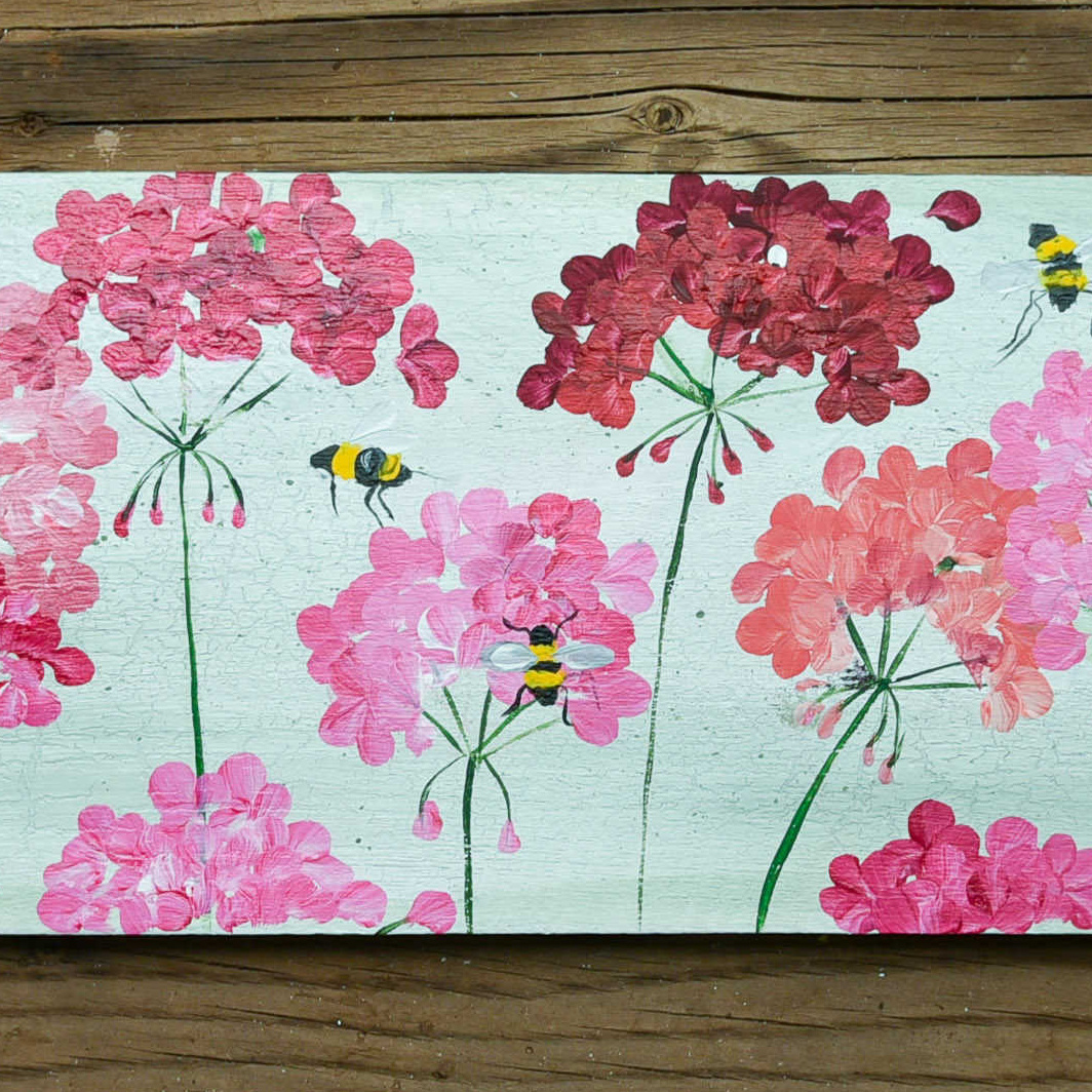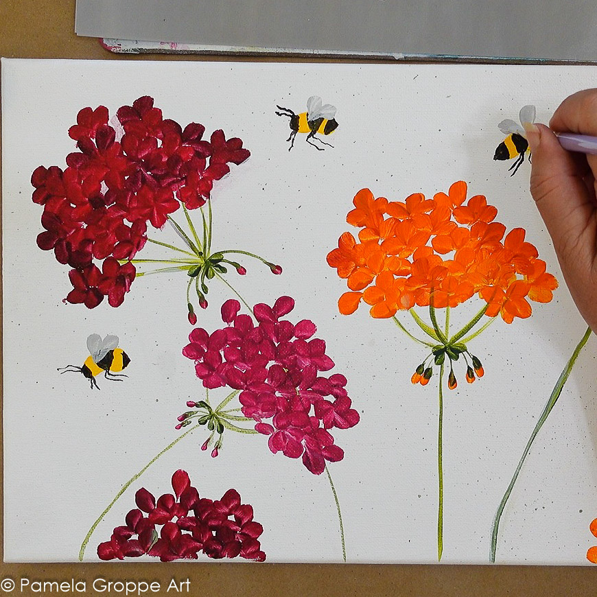 Easy acrylic painting for everyone. Paint bright, beautiful geraniums (pelargoniums) with some fat little bumblebees. No experience is needed. For helpful tips, tricks and additional information see Pamela Groppe Art.