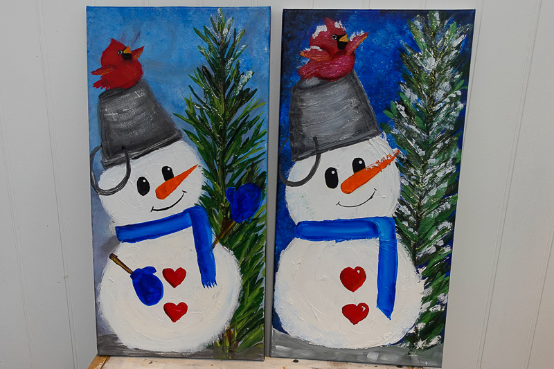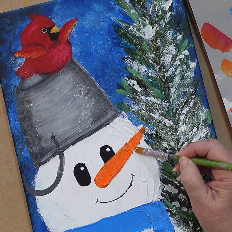 With the added texture and a touch of sparkle, this snowman and cardinal pair are a fun project to create. Paint it on a wood board for a porch sign. Add lettering or make wider by adding another tree, more birds. The options are only limited by your imagination!