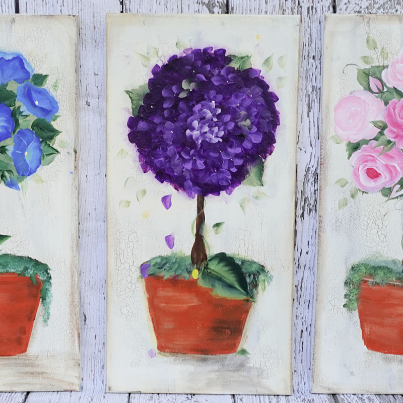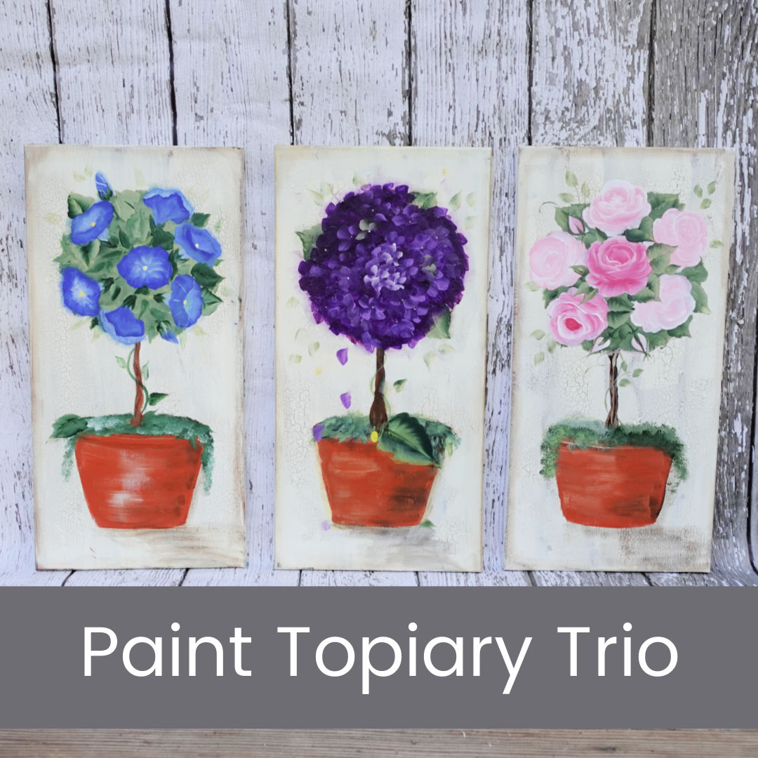 Paint all 3 Topiary paintings and create a beautiful feature wall in your home. Each topiary painting lesson has step by step instructions and a video you can download to view offline.